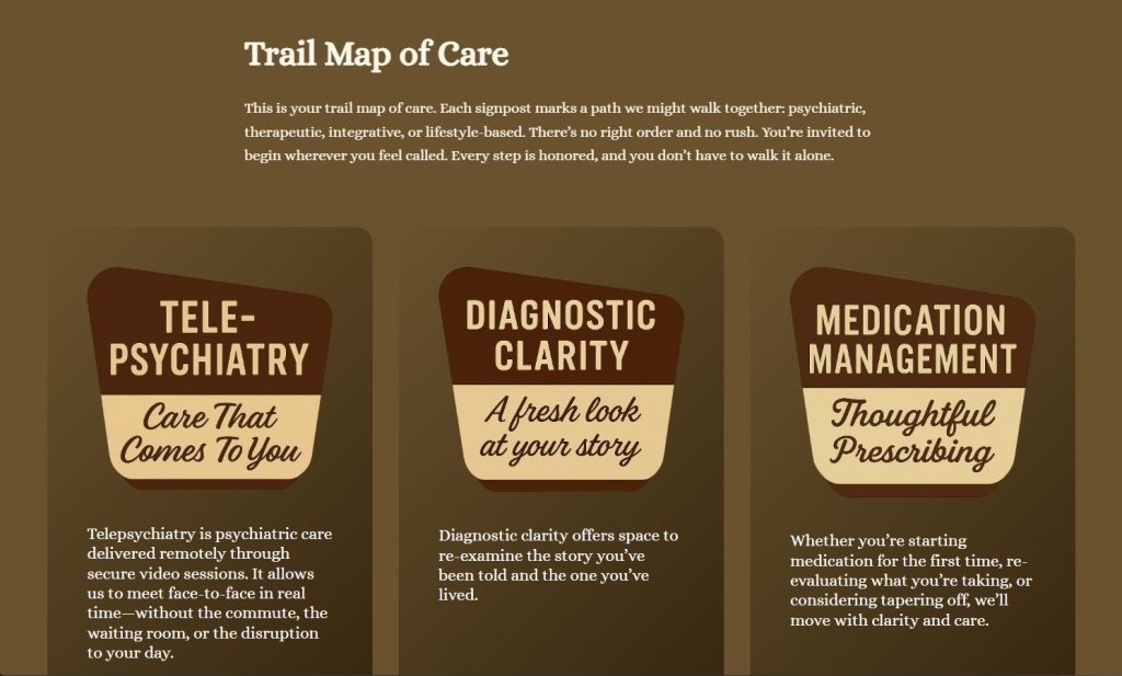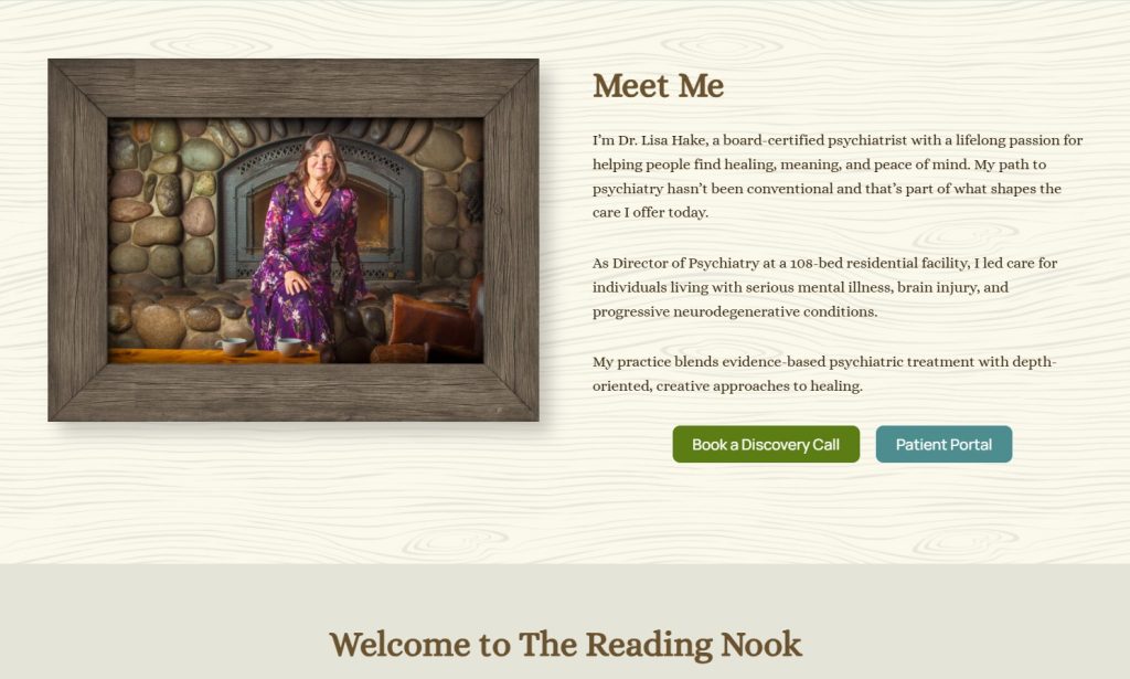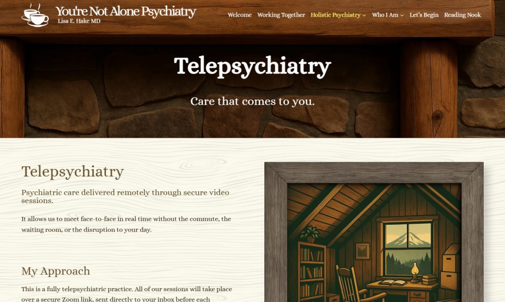 Dr. Lisa Hake came to us with the challenge of creating a website to promote her remote psychiatry practice that felt inviting and comfortable. We worked together on the aesthetic of rustic cabin and even shot portraits in Sisters Coffee Company to portray the cabin atmosphere.